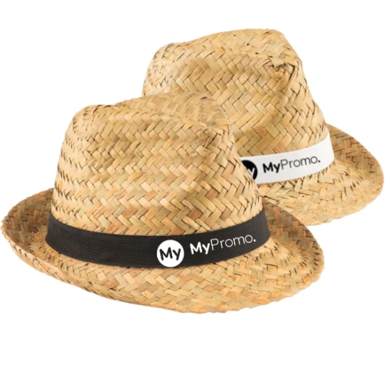 Strohoed met polyester band voor bedrukking. Bij onbewerkte orders wordt de polyester band los meegeleverd.