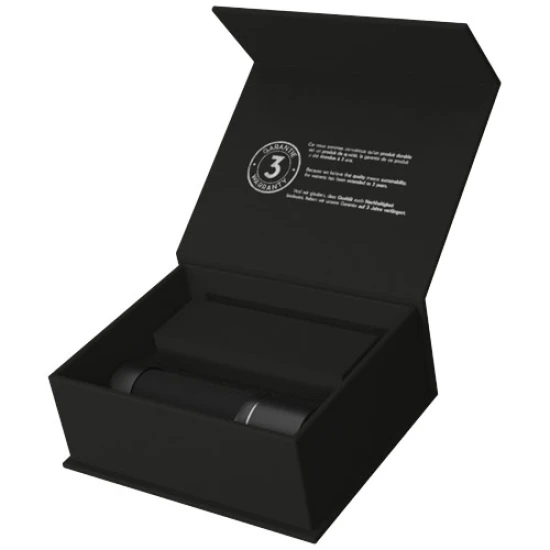 Draadloze oordopjes met premium geluidskwaliteit. De oordopjes kunnen worden opgeborgen en opgeladen in de cilindrische metalen basis, die met een oplichtend logo kan worden bedrukt. De batterij in de basis kan de oordopjes twee keer opladen. Ingebouwde microfoon. Bluetooth® 5.0. EDR-technologie (Enhanced Data Rate). De oordopjes zijn gecoat met een rubberen afwerking en antibacteriële behandeling. Inclusief 3 verschillende maten oordopjes voor een optimale luisterervaring. Octrooi EUROPA EUIPO. Verpakt in een zwarte geschenkverpakking (10 x 6 x 3,5 cm). met magnetische sluiting. Inclusief 3 jaar garantie. ABS Plastic, Metaal.