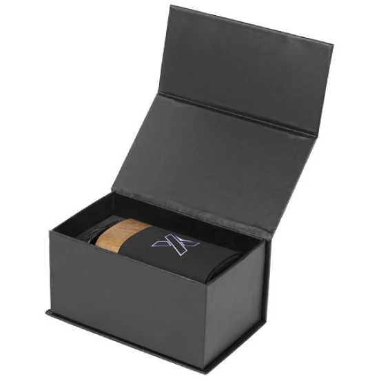 Draadloze 5 W houten en rubberen Bluetooth® speaker met antibacteriële behandeling en oplichtend logo en dubbele geluidsuitgang voor een geluidskwaliteit die ongeëvenaard is voor een speaker van dit formaat. Heeft een ingebouwde microfoon en functie voor conferentiegesprekken. Capaciteit: 800 mAh - 3,7 V. Frequentie: 50 Hz - 20 KHz. Uitgang: 1 x 5 W. S/N: 65db. Impedantie: 4 Ω. Bluetooth® JL 4.2. Nettogewicht: 152 gram. Afmetingen: 91 x 58 x 58 mm. Geleverd in een geschenkverpakking met magnetische sluiting, gemaakt van gerecycled papier. Rubber, Bamboe hout.
