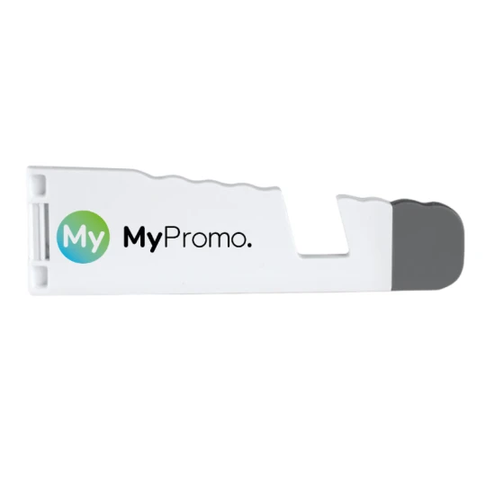 Tablet en smartphone houder van wit ABS met grijze, siliconen uiteinden.