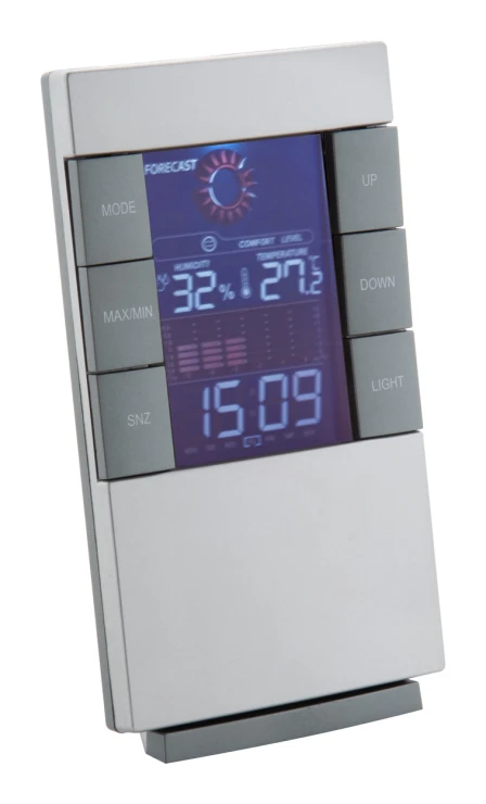 Je hoeft geen professionele weerman te zijn om te weten welke kleren je moet dragen. Met dit multifunctionele weerstation ben je altijd op de hoogte van de huidige temperatuur en luchtvochtigheid. Het kleurrijke display geeft niet alleen de tijd en datum weer, maar ook de trend van de temperatuur. Opstaan was nog nooit zo gemakkelijk dankzij het alarm. Het compacte ontwerp maakt het perfect als relatiegeschenk voor klanten die veel onderweg zijn. Bovendien kan je je logo of bedrijfsnaam laten bedrukken om je merkbekendheid te vergroten. Batterijen niet inbegrepen.