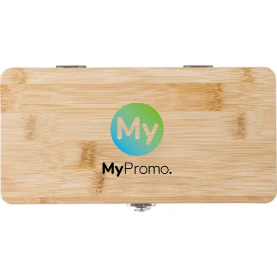 27-delige koolstofstalen gereedschapsset. Inclusief: drie schroevendraaiers, tien bits in houder, drie sleufmaten, drie Torx-maten, een adapter, vier doppen, een snijder, een handvat en een connector. Verpakt in een bamboe koffer met ijzeren clip.