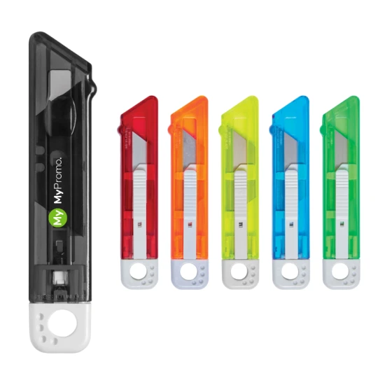 Cutter knife SLIDE IT met een schuifmechanisme en veer voorzien van een vervangbaar mes en een stevige gekleurde kunststof behuizing ontworpen voor comfortabel gebruik inclusief een oogje aan het uiteinde van de greep om eenvoudig op te hangen compacte afmetingen van 12.5 x 2.5 x 1.3 cm waardoor het een praktische tool is voor nauwkeurig snijden