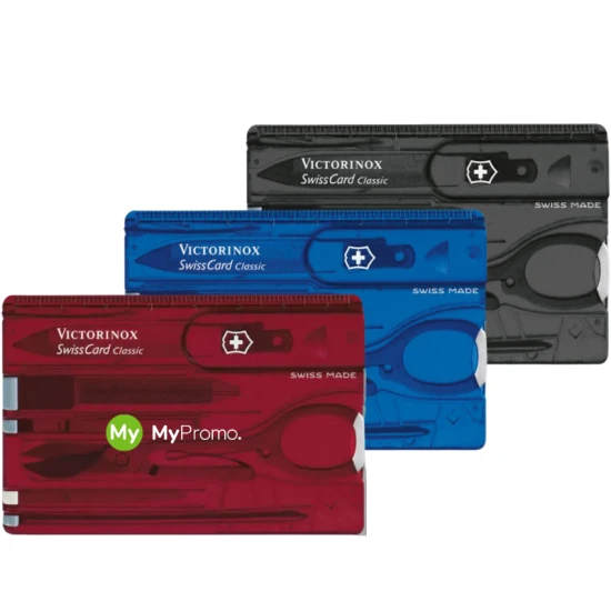 Nylon Victorinox Swisscard Classic multifunctionele tool, inclusief: brievenopener, pincet, schaartje, nagelvijl, tandenstoker, balpen, gradenboog en stalen pin. Individueel verpakt in geschenkverpakking.