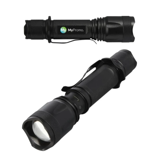 Jij bent altijd voorbereid met deze krachtige, oplaadbare aluminium zaklamp. Met een stevige zwarte behuizing van aluminiumlegering en een schokbestendigheid van 1 meter, biedt deze zaklamp een tactische uitstraling. De zaklamp is spatwaterdicht met een IPX4-classificatie en heeft een riemclip om gemakkelijk mee te nemen. Met zijn 5 W led produceert hij 300 lumen voor maximaal 3 uur en heeft een straalafstand van 200 meter met vijf verschillende lichtstanden: hoog, medium, laag, stroboscoop en SOS. De ingebouwde lithiumbatterij met een capaciteit van 2000 mAh zorgt voor het hoge vermogen. Deze zaklamp is perfect als promotieartikel of relatiegeschenk en wordt geleverd in een geschenkverpakking van gerecycled karton. Gegarandeerd een opvallend en praktisch cadeau-idee!