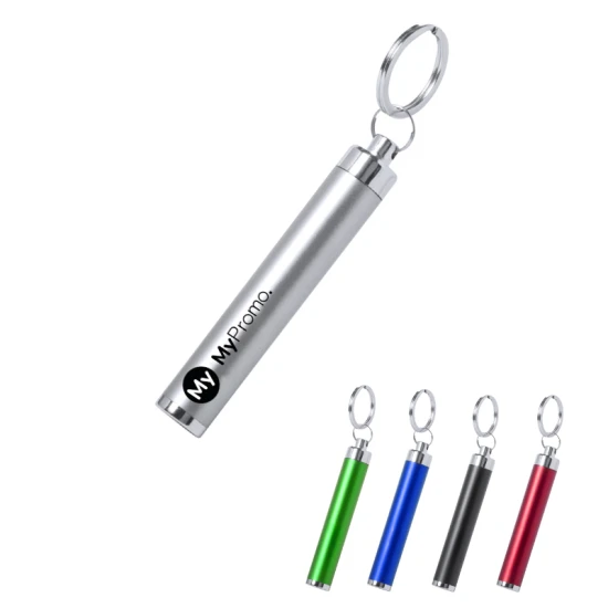 Plastic zaklamp met 1 LED en metalen sleutelhanger. Na gravure wordt het logo verlicht. Incl. knoopcel batterijen.