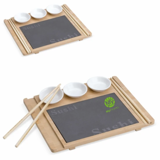 Maak jouw sushi-ervaring compleet met deze unieke houten sushi set, gemaakt van duurzaam bamboe. Het presenteerbord biedt genoeg ruimte om samen te genieten van de lekkerste sushi. De bijbehorende kommetjes zijn perfect voor het serveren van sojasaus, wasabi en gember. Met deze eco-vriendelijke set geef je niet alleen een uniek en praktisch relatiegeschenk, maar draag je ook bij aan een duurzamere wereld. Personaliseer de set met jouw eigen ontwerp en maak indruk op jouw relaties en klanten. Krijg jij al trek in sushi? Jouw klanten en relaties vast en zeker!