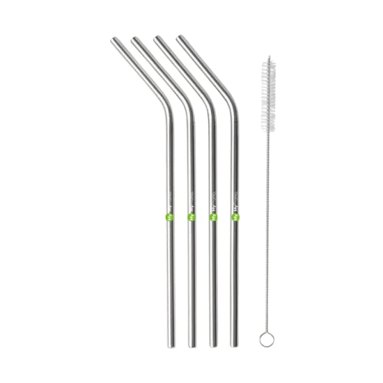 Vier roestvrijstalen, milieuvriendelijke drinkrietjes. De lengte van de rietjes is 23 cm. Inclusief schoonmaakborsteltje.