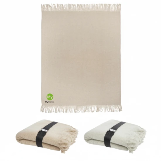 Ultrazachte RPET mohair deken, omwikkeld met een 190T RPET-lint. Verpakt in een gerecyclede polybag. Lengte franjes: 10 cm aan elke kant. Afmetingen lint: 72 cm x 4 cm. 100% Gerecycled polyester, 215 g/m2, 190T van 100% Gerecycled polyester.