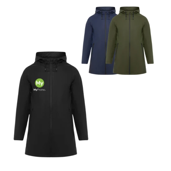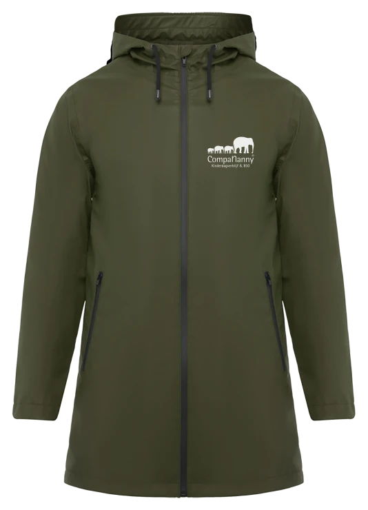 Waterdichte regenjas. Capuchon met klep. Door hitte gesealde ritsen en naden. Contrasterende details in zwart. Twee zijzakken met rits. Split aan de achterkant. Verwijderbaar etiket. Waterbestendig. Het model is 185 cm en draagt maat M. Polyurethaan van 100% Polyester, 210 g/m2.