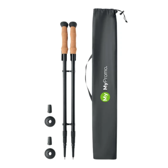 Volledig verstelbare nordic walking stokken van aluminium met kurken handvatten, rubberen wandeltips en moddervangers. gepresenteerd in een rpet ripstop etui. volledig verstelbaar: 65cm tot 135cm.