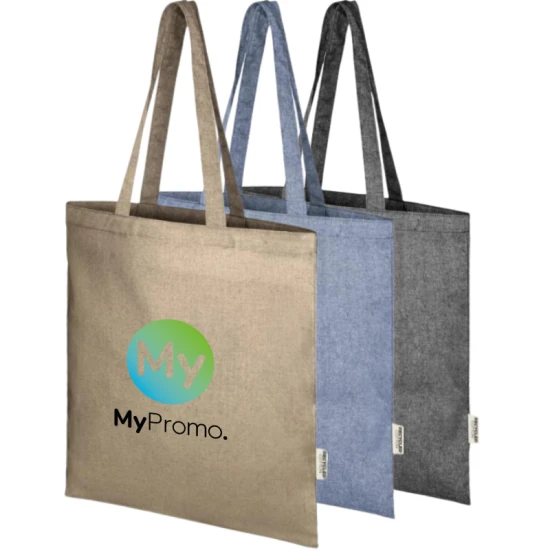Draagtas van een mix van 150 g/m² gerecycled katoen en polyester. Deze tas kan gemakkelijk worden opgevouwen zodat hij in een kleine ruimte past en is de perfecte metgezel voor een verscheidenheid aan activiteiten, zoals boodschappen doen, dagtochten of knutselprojecten. Gerecycled katoen wordt vervaardigd uit voor consumenten bestemd afval dat in textielfabrieken tijdens het snijproces wordt geproduceerd. Soortgelijke kleuren worden met elkaar gemengd, waardoor extra verven overbodig is. Vanwege de aard van gerecycled katoen, kan er sprake zijn van een zeer lichte kleurvariatie. Dit draagt duidelijk bij aan een meer authentieke uitstraling. Elke tas wordt ook geleverd met een Aware™ tracer. Met deze innovatieve functie kunnen gebruikers de oorsprong en de reis van hun artikel volgen via een QR-code, waardoor de transparantie in de toeleveringsketen wordt vergroot en er een sterkere band is tussen het product en het productieproces. Geschikt voor een gewicht tot 5 kg. Lengte handvat: 31 cm. 80% Recycled cotton en 20% Gerecycled polyester.