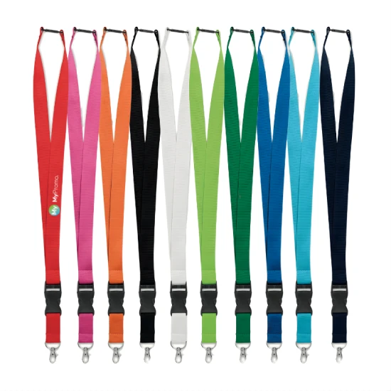 Lanyard met metalen karabijnhaak en veiligheidssluiting. Het onderste gedeelte kan losgeklikt worden d.m.v. een kunststof clip. Breedte 25 mm. Sublimatie bedrukking alleen geschikt op het witte item.