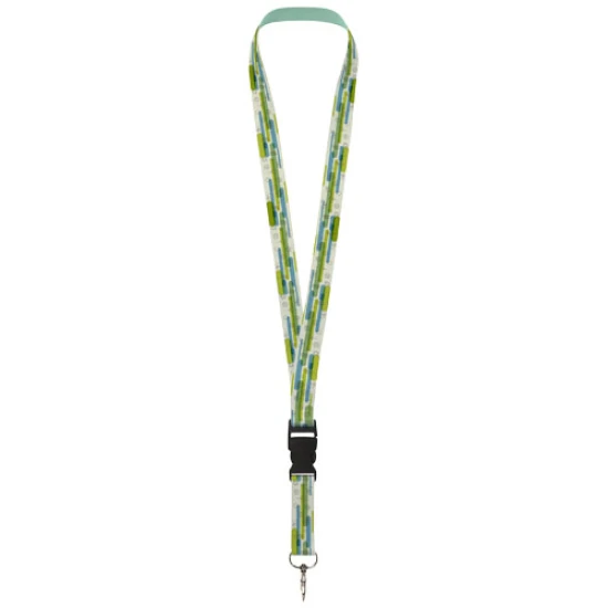 Gerecycled PET full colour design sublimatie lanyard met gerecycled PET koord en een metalen haak en gerecycled PET plastic gesp. Bevat decoratie in full-colour aan twee kanten. Kan een naambadge, ID-kaart of sleutels bevatten. Gerecycled polyester.