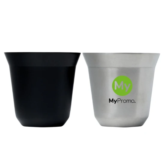 Set van 2 dubbelwandige RCS gecertificeerde roestvrijstalen espressokopjes. Volume is 80 ml. Gepresenteerd in een gerecyclede kartonnen geschenkverpakking. 91% RCS certified recycled stainless steel.
