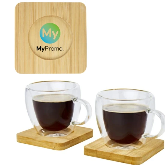 Twee is beter dan één! Deze set van twee dubbelwandige thermische glazen met bamboe onderzetters is de perfecte toevoeging aan jouw keukencollectie. De bamboe onderzetter is niet alleen stijlvol, maar ook nog eens milieuvriendelijk. Het bamboe is afkomstig van duurzame en verantwoorde bronnen. Door het dubbele borosilicaatglas blijft de temperatuur van jouw drankje langer behouden, waardoor je extra kunt genieten van jouw favoriete warme of koude drankje. Met een inhoud van 100 ml per glas heb je genoeg ruimte om te genieten. Verras jouw relaties met deze trendy set als relatiegeschenk of gebruik het als promotieartikel om jouw merk te laten stralen!