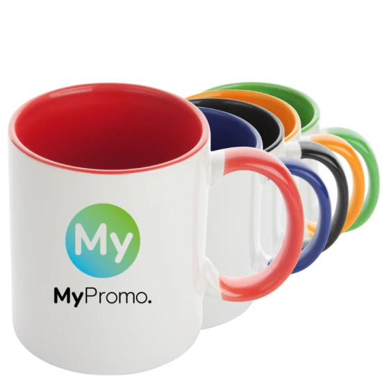 Keramische mok met een gekleurd binnenkant en oor. Met een speciale coating voor sublimatie. Inhoud: 300 ml.