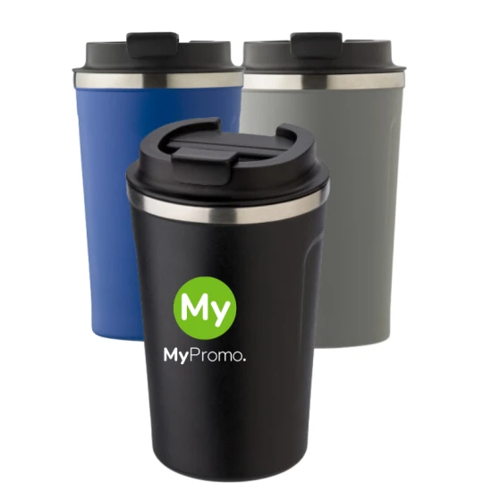 Roestvrijstalen dubbelwandige mok (380 ml). De deksel heeft een drinkopening met sluiting.