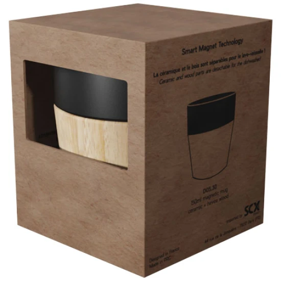 Keramische mok van 150 ml met magnetische houten basis, ideaal voor espresso of espresso lungo. Er wordt slimme magneettechnologie gebruikt om de houten basis los te maken van de keramische mok zelf voor eenvoudige reiniging. Geleverd in een geschenkverpakking van gerecycled kraftpapier (7,6 x 7,6 x 9,5 cm). Keramiek, Rubberwood. Voor een afdruk die bestand is tegen vaatwasmachine wasbeurten, raden wij aan te kiezen voor een keramische of sublimatiedruk.