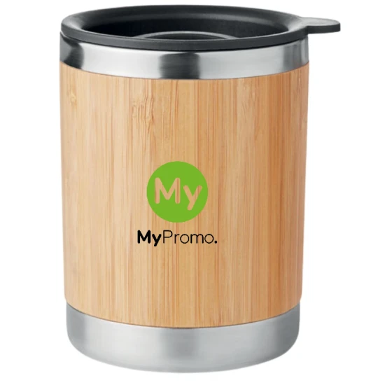 Roestvrijstalen dubbelwandig drinkbeker met bamboe buitenkant en deksel met drinkopening. Inhoud 250ML. Bamboe is een natuurlijk materiaal waardoor kleur per item kan verschillen. Voor een afdruk die bestand is tegen vaatwasmachine wasbeurten, raden wij aan te kiezen voor een keramische of sublimatiedruk.