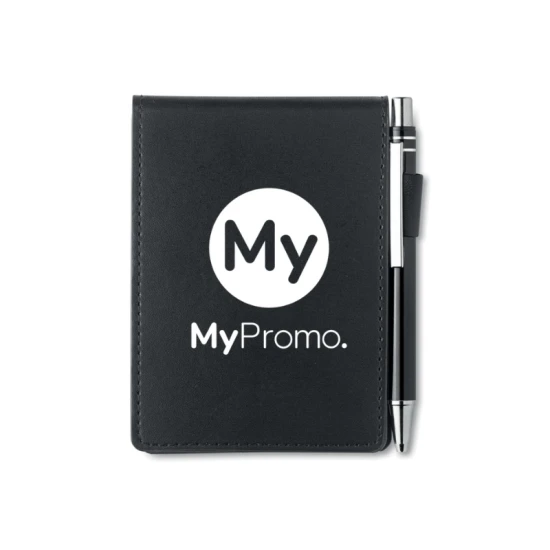 Schrijfblokje met 60 vel blanco A7 papier (70 grams) met balpen (blauwe inkt) in PU etui.