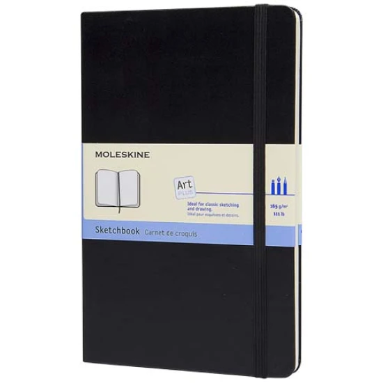 Het Moleskine grote schetsboek is met karton gebonden met een afgeronde kaft en heeft zuurvrij hoogwaardige papier. Het schetsboek heeft een bladwijzer, een elastische sluiting en een uitvouwbaar binnenvak met daarin de geschiedenis van Moleskine. FSC gecertificeerd papier.
