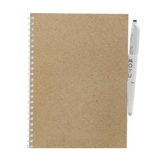Uitwisbaar A5 notitieboek van steenpapier van het merk MOYU. De stevige kaft is gemaakt van 440 gram gerecycled kraftkarton. Inclusief pen en schoonmaakdoekje. Elke steenpapieren pagina is duurzaam geproduceerd, natuurlijk boomvrij en 100% recyclebaar. Dit notitieboek met elastische pennenlus is gebonden in een sterke wire-o binding en heeft 18 pagina's gelinieerd papier. Maak je aantekeningen met de meegeleverde speciale MOYU-pen. De pen bevat de originele Frixion-inkt. De inkt droogt volledig op steenpapier en is gemakkelijk uit te wissen zonder sporen achter te laten. Bevochtig het bijgeleverde MOYU-doekje lichtjes met wat water en wis de inkt uit. Dit laat de pagina's blanco achter voor nieuwe ideeën en takenlijsten. Je kunt steenpapier ongeveer 500 keer beschrijven. Dit notitieboek gaat jarenlang mee. Steenpapier is gemaakt van 80% kalksteen en 20% schoon plastic. Het is van nature vrij van bomen, en er is geen water en geen chemicaliën nodig om het te maken. Daarom is de productie van steenpapier economischer en is er 67% minder CO2-uitstoot dan bij de productie van pulp papier. Bovendien is steenpapier eindeloos recyclebaar, zonder dat er nieuwe grondstoffen aan toegevoegd hoeven te worden.
