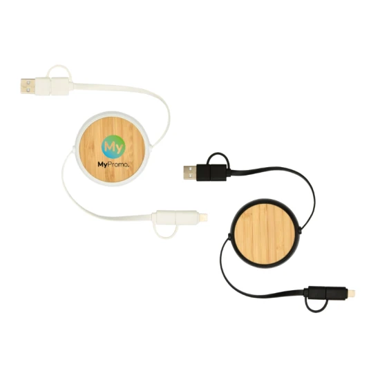De Chechia 5-in-1 intrekbare datasynchronisatie- en 45 W snellaadkabel is gemaakt van gerecycled plastic met accenten van verantwoord geproduceerd bamboe. De kabel heeft USB-A- en Type-C-ingangsconnectoren, gecombineerd met een 2-in-1 Type-C- en Lightning/Micro USB-combi-uitgangsconnector. USB-C naar USB-C levert een uitgangsvermogen van maximaal 45 W, USB-A naar USB-C maximaal 24 W en alle andere aansluitmogelijkheden maximaal 15 W. Compatibel met zowel CarPlay als Android Auto en hij heeft ook een ingebouwde telefoonstandaard voor extra gemak. Of je nu thuis, op kantoor of onderweg bent, de Chechia kabel levert prestaties en stijl in één compact pakket. Kabellengte: 100 cm. FSC gecertificeerde bamboe , Gerecylced ABS plastic.