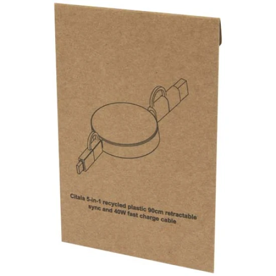 De Citala 5-in-1 intrekbare datasynchronisatie- en 40 W snellaadkabel is gemaakt van gerecycled plastic. De kabel heeft USB-A- en Type-C-ingangsconnectoren, gecombineerd met een 2-in-1 Type-C- en Lightning/Micro USB-combi-uitgangsconnector. USB-C naar USB-C levert een uitgangsvermogen van maximaal 40 W, USB-A naar USB-C maximaal 18 W en alle andere aansluitmogelijkheden maximaal 15 W. Compatibel met zowel CarPlay en Android Auto. Of je nu thuis, op kantoor of onderweg bent, de Citala kabel levert prestaties en stijl in één compact pakket. Kabellengte: 90 cm. Gerecylced ABS plastic.