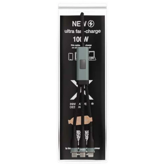 5-in-1 ultrasnelle rPET 100 W ultrasnelle oplaadkabel waarmee je smartphones, tablets en laptops kunt opladen. Dankzij de dubbele USB-A + USB-C-ingang is de kabel 100% compatibel met de nieuwste computermodellen. Uitgang: Type-C, Micro USB en Lightning. Geleverd met recyclebare TPU-etui en een inlegvel van gerecycled papier. Kabellengte: 1 meter. Gerecycled aluminium, Gerecylced PET plastic.
