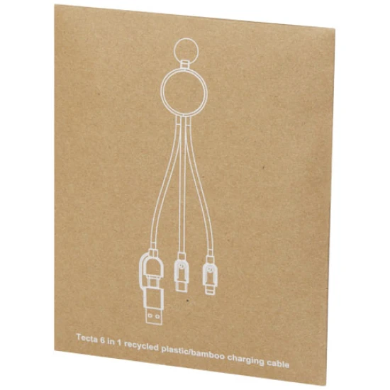 De Tecta 6-in-1 oplaadkabel van bamboe en gerecycled plastic laat zien waar duurzaamheid en stijl samenkomen. Met een lengte van 25 cm levert deze RTPE-kabel 2A laadvermogen. Ingang: USB A en Type-C. Uitgang: Type-C, micro-USB en 2-in-1 micro-USB en lightning dual tips die compatibel zijn met zowel iOS- als Android-apparaten. De aluminium USB-uitgangen zorgen voor een veilige en stabiele verbinding, waardoor je altijd betrouwbaar kunt opladen. De sleutelhanger van zilverkleurig roestvrijstaal dient als een handige manier om de kabel te organiseren en te dragen. Verpakt in een doos van gerecycled kraftpapier. Gerecylced ABS plastic, Bamboe hout.