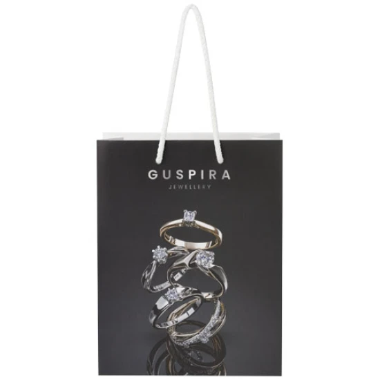 Medium handgemaakte matte integra papieren tas (18 x 9 x 23 cm) van 170 g/m2 met plastic handgrepen. De aanpasbare voor- en achterkant bieden voldoende ruimte voor het afdrukken van een logo of een ander ontwerp, waardoor het een uitstekende zakelijke marketingtool is. Gemaakt in Europa. Gerecycled papier, 170 g/m2.