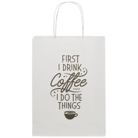Medium tas van kraftpapier (24 x 9 x 32 cm) van 120 g/m2 met gedraaide papieren handgrepen. De aanpasbare voor- en achterkant bieden voldoende ruimte voor het afdrukken van een logo of een ander ontwerp, waardoor het een uitstekende zakelijke marketingtool is. Gemaakt in Europa en 100% recyclebaar, waardoor deze tas een duurzamere keuze is voor milieubewuste bedrijven en mensen die op zoek zijn naar een duurzame verpakkingsoplossing. Recycled kraft paper, 120 g/m2.