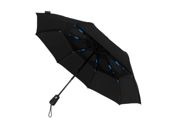 Ontdek de ultieme reisgenoot met onze opvouwbare paraplu. Ontworpen met een windbestendig en automatisch open/dicht systeem, beschikt deze 3-delige paraplu over een slanke zwarte schacht en een duurzaam zwart en blauw frame van glasvezel. Het hoogwaardige doek is volledig gemaakt van gerecyclede PET-flessen en bevat een ventilatiesysteem voor extra duurzaamheid. Het sterke, flexibele frame van glasvezel zorgt voor maximale duurzaamheid, waardoor deze paraplu de perfecte keuze is voor milieubewuste reizigers. Geniet van de luxe hoes en de minimale ecologische voetafdruk bij elk gebruik.