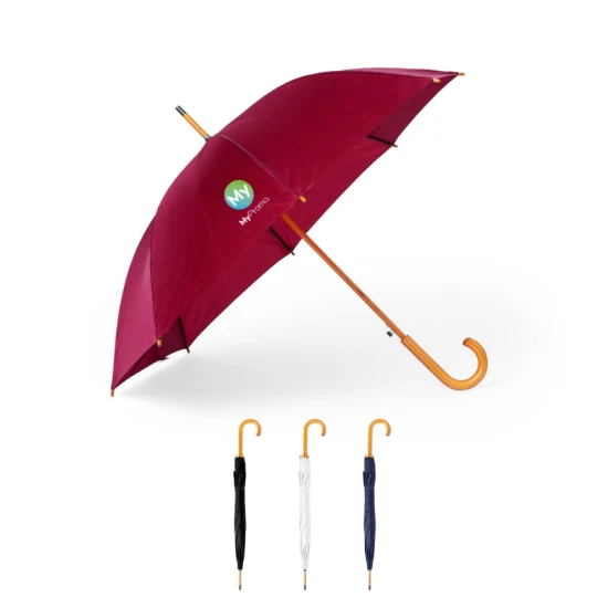 Paraplu met 8 panelen en een diameter van 105 cm, gemaakt van sterk 190T polyester. Automatisch te openen, met gebogen houten handvat en houten steel. Met zwarte metalen baleinen, klittenbandsluiting en verkrijgbaar in diverse kleuren.