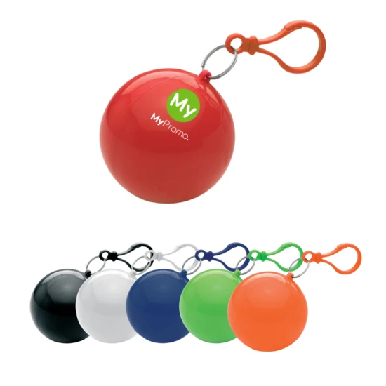 Transparante poncho verpakt in kunststof AS bal met karabijnhaak om op te hangen.