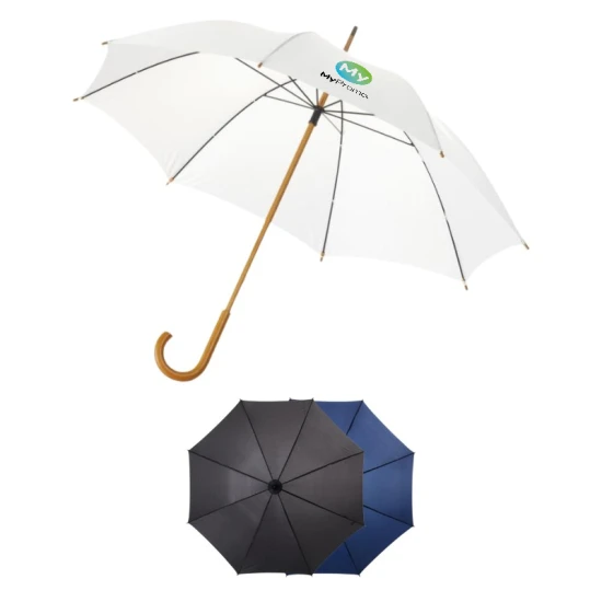 23" paraplu met houten handvat, houten schacht en metalen baleinen. Polyester.