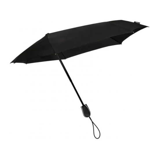 ST-9 STORMini® aerodynamische opvouwbare stormparaplu. Deze verbeterde versie van onze stormparaplu is getest in een windtunnel en weerstaat moeiteloos windstoten tot 80 km/u. Het heeft een zwarte versterkte 3-delige schacht en een versterkt zwart aluminium/glasvezel frame. Het heeft ook een zeer comfortabele matzwarte handgreep en wordt geleverd in een hoes. De brede achterkant van de STORMini® biedt maximale bescherming tegen regen!