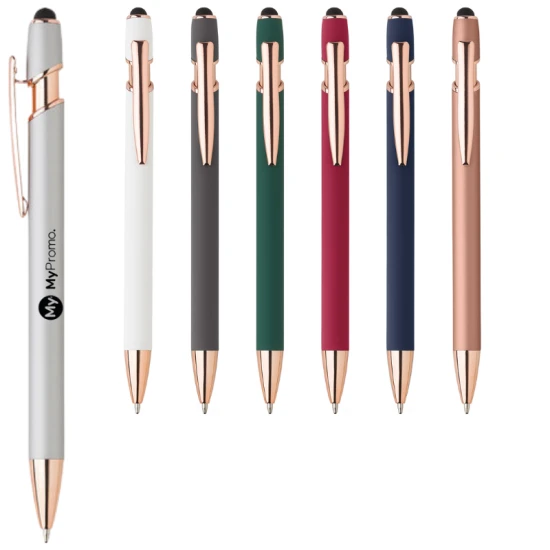 Aluminium balpen met roségouden details en stylus. Blauwschrijvend.