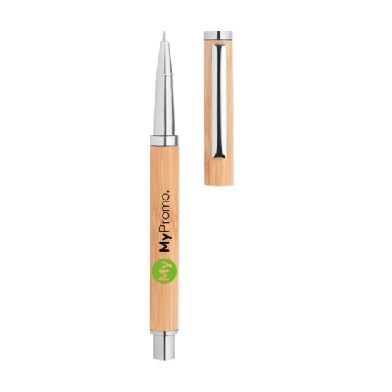 Bamboe rollerbalpen met roestvrijstalen uiteinden en details. Blauwe gel inkt. Bamboe is een natuurlijk product, de kleur per artikel kan verschillen.