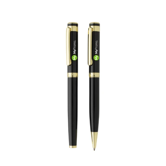 Verhoog je schrijfervaring met de Swiss Peak Luca RCS Recycled Brass Deluxe Pen Set. Ontworpen met een gevoel voor verfijning, bevat deze set slanke zwarte pennen met gouden accenten, waaronder het bovenste deel, de bovenring, de clip, de middenring en de punt. Gemaakt van 55% RCS-gecertificeerd gerecycled messing, bieden deze pennen zowel elegantie als duurzaamheid. De balpen werkt met een draaisysteem en bevat een navulling met blauwe inkt, die 1,0 mm breed schrijft voor maximaal 1200 m. De doppenpen beschikt over blauwe gel-inkt en biedt 800 m soepel schrijven in dezelfde breedte van 1,0 mm. Beide pennen zijn afgewerkt met een stalen clip en zijn gegraveerd met het Swiss Peak-logo op de middenring. Geleverd in een premium geschenkdoos, straalt deze set luxe en stijl uit.