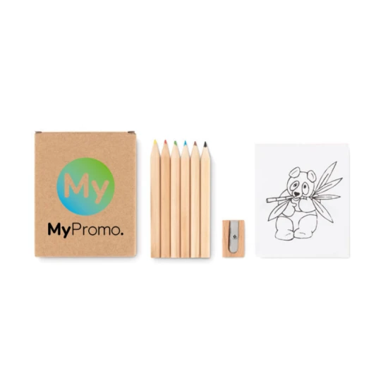Kleurset met 6 kleurpotloden, een houten puntenslijper en 20 kleurblaadjes in een doosje.