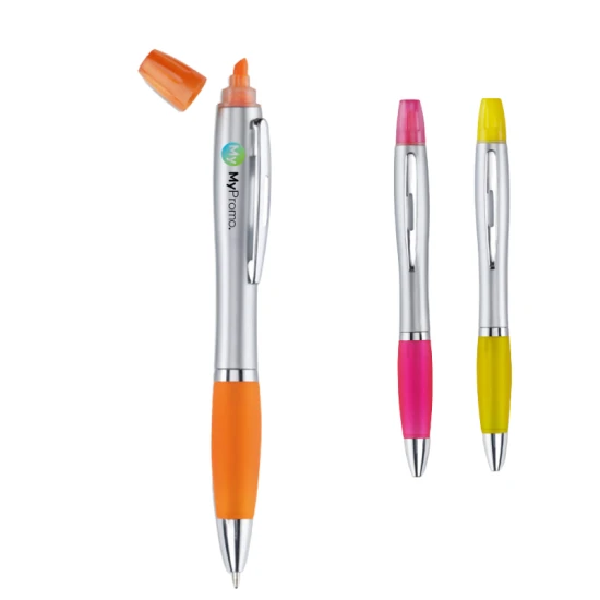Balpen en markeerstift in één. Vrolijk gekleurde rubberen grip, mat zilveren body en chromen details.