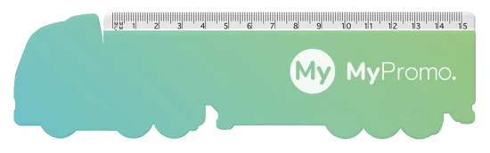 Liniaal in de vorm van een vrachtwagen van stevig gerecycled plastic met markeringen in inch of centimeter. Gerecylced HIPS plastic.
