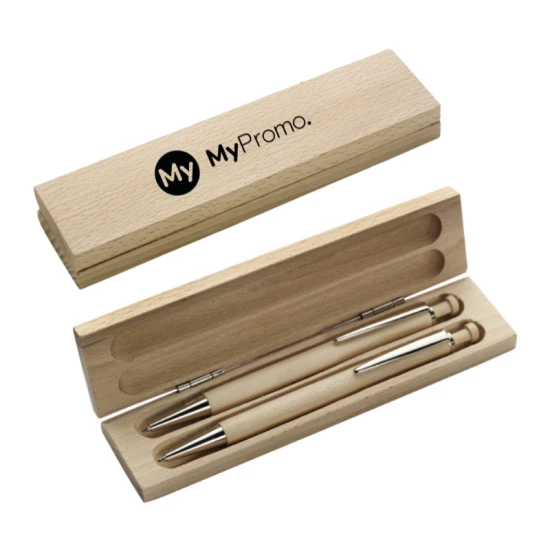 Met deze pennenset laat je een blijvende indruk achter. De combinatie van een balpen en mechanisch potlood in een stijlvol beukenhouten etui maakt dit tot een perfect relatiegeschenk voor jouw zakenpartners en klanten. De natuurlijke uitstraling van het hout geeft dit product een luxe en authentiek karakter. Met de blauwe inkt van de balpen en de precisie van het vulpotlood, schrijf je moeiteloos en stijlvol. Door de hoogwaardige materialen behoudt deze pennenset zijn kwaliteit en kan hij jarenlang gebruikt worden. Kies voor een tijdloos en praktisch geschenk met deze elegante pennenset.