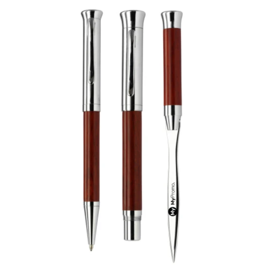 Met deze elegante pennen set geef je jouw klanten of collega's een blijvend geschenk dat altijd van pas komt. De set bevat een stijlvolle balpen met comfortabel draaimechanisme en een zwarte navulling, een klassieke vulpen en een handige briefopener. Alles verpakt in een luxe etui van hoogwaardig rozenhout. Maar deze set is niet alleen mooi om te zien, hij schrijft ook nog eens fantastisch! De combinatie van rozenhout en aluminium geeft deze set een eigentijdse en zakelijke uitstraling. Een perfect relatiegeschenk om jouw bedrijf op een professionele en persoonlijke manier te presenteren. Laat je logo op de etui en pennen graveren en laat de ontvangers zien dat jij oog hebt voor kwaliteit en stijl. Geef met deze set een uiting van jouw waardering voor jouw klanten of collega's en maak indruk met dit prachtige relatiegeschenk.