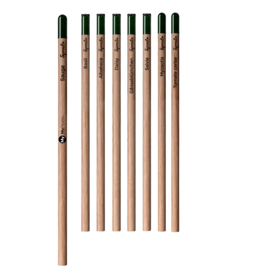 De naam van het zaadje kan ook worden gegraveerd in het Duits, Frans, Italiaans en Spaans. Neem contact op met je accountmanager voor meer informatie. Gebruik je potlood, plant het laatste stukje en kijk hoe het groeit. Het Sprout™-potlood is gemaakt van hout afkomstig uit duurzaam beheerde bossen, en is loodvrij. Het potlood is inclusief lasergravure printen.