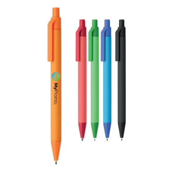 Balpen met papieren houder en drukmechanisme. De clip, drukknop en punt zijn gemaakt van 100% maïs PLA. Blauwe inkt.