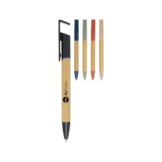 Bamboe balpen die ook dienst doet als telefoonhouder. De knop en middenring zijn gemaakt van gerecycled plastic, de punt is gemaakt van messing en de houder is gemaakt van verantwoord gewonnen bamboe. Inktkleur: zwart. Schrijflengte: 1000 meter. Stiftmaat: 1,0 mm. FSC certified bamboo.