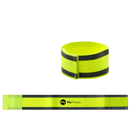 Veiligheidsarmband met twee reflecterende strepen, voor promotioneel gebruik. De reflectieve strepen zijn 1 cm wijd. De band is 32,5 cm lang en sluit met klittenband.